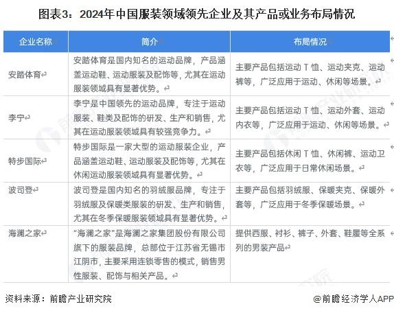 中国服装领先企业主要有安踏体育、李宁、特步国际等,企业具体布局情况如下: