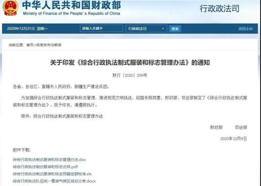 为加强综合行政执法制式服装和标志管理,推进规范文明执法,12月9日,财政部、司法部印发了《关于印发