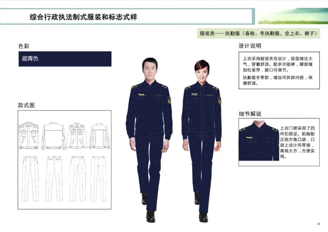 一是执行统一的式样。制定了统一的综合行政执法队伍制服的式样和颜色,并制作了综合行政执法制式服装和标志式样图册。式样图册随《办法》一并发布,作为各地制作制服的依据。