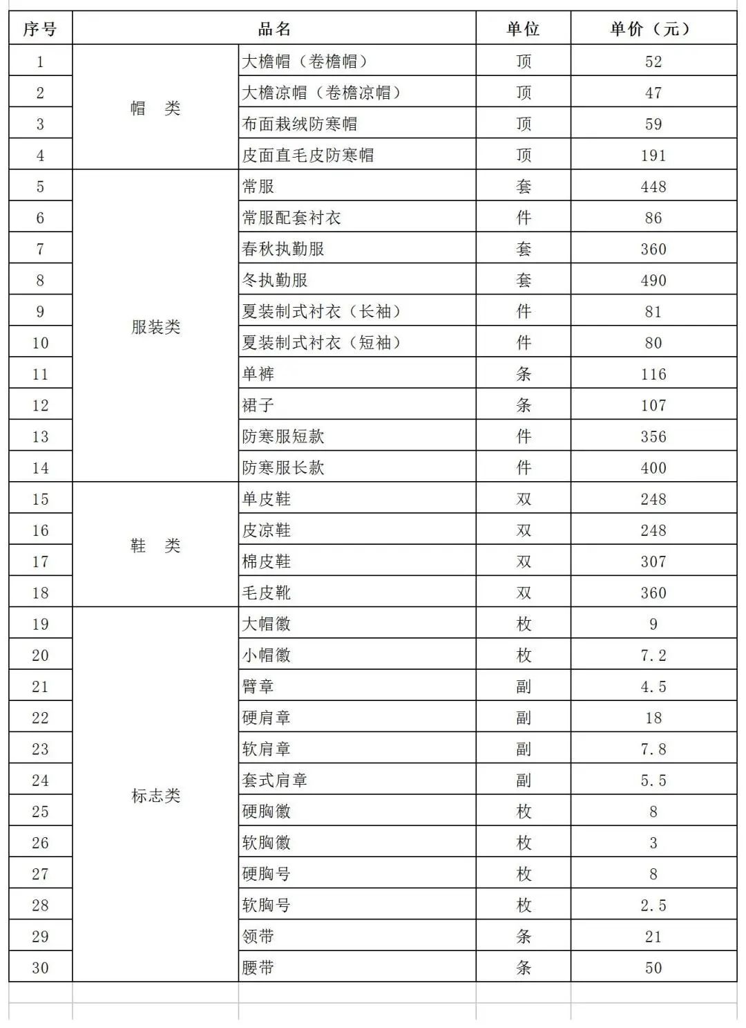 (二)执勤服(春秋、冬执勤服,含上衣、裤子)。