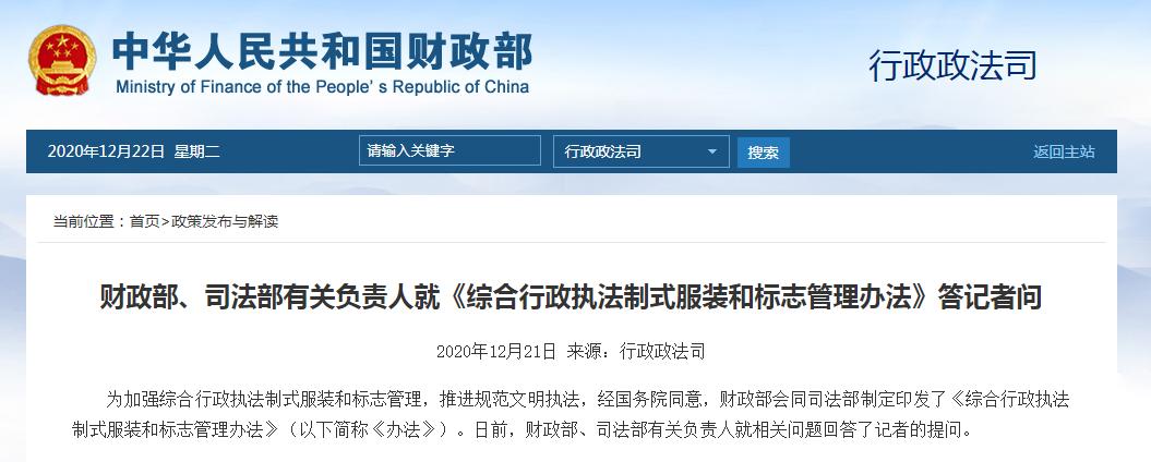 财政部、司法部有关负责人就《综合行政执法制式服装和标志管理办法》答记者问